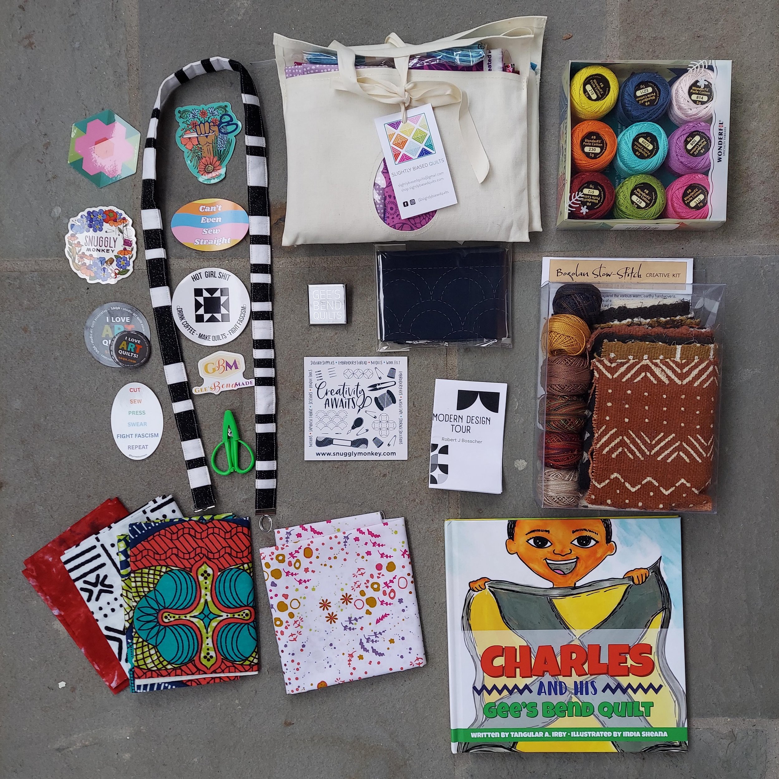I also had a chance to visit some of the vendors and found some lovely treasures to bring home with me, including fabric scraps and a thread collection from my friend Jenn of Slightly Biased Quilts, and a slow stitch bogolan/mudcloth kit from Cultured Expressions that I can’t wait to play with!