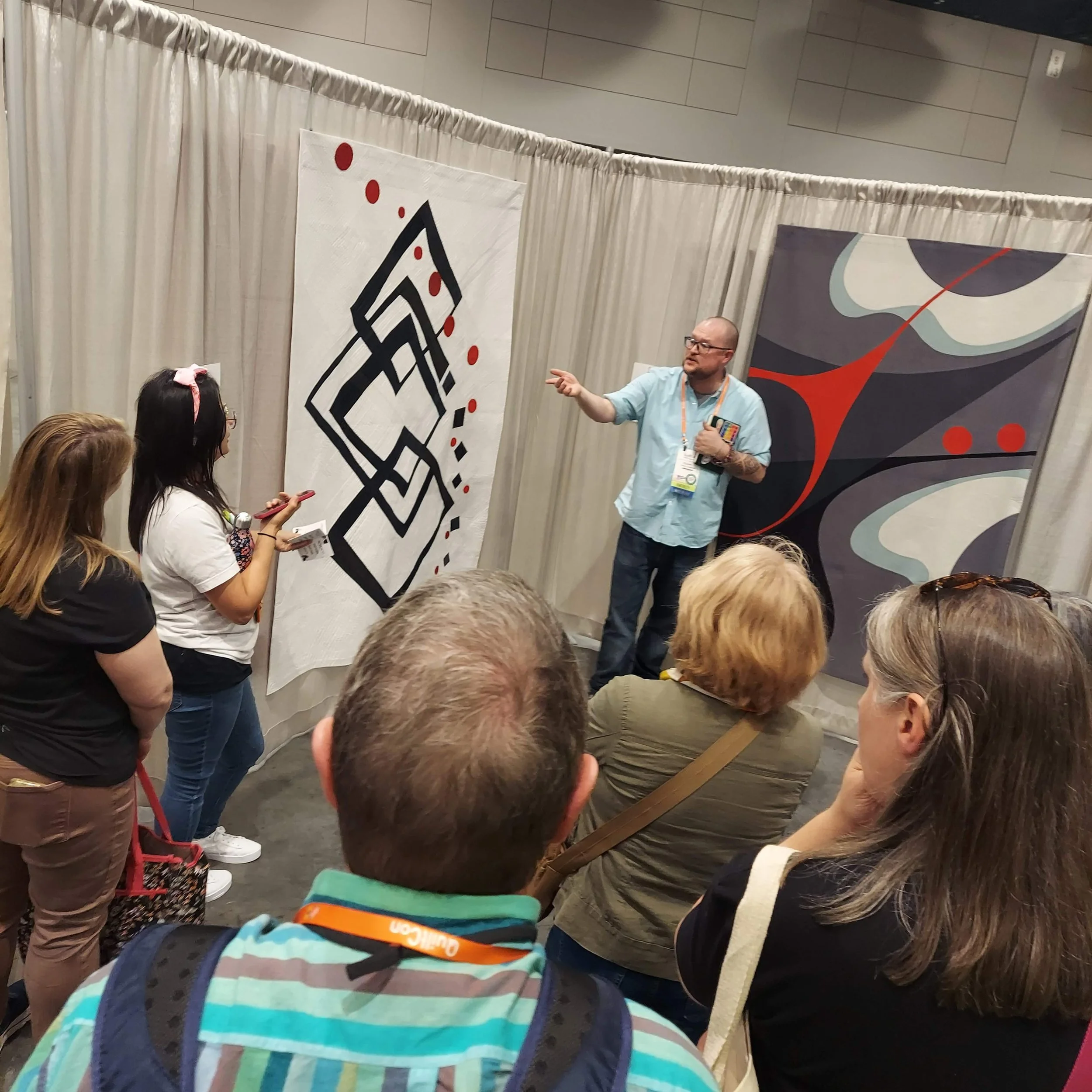 Something new I got to try is an after-hours Design Tour of the quilts in the show. Led by Robert J. Bosscher, our group walked through the aisles, identifying and discussing different elements of art and principles of design the quilters used in their quilts.