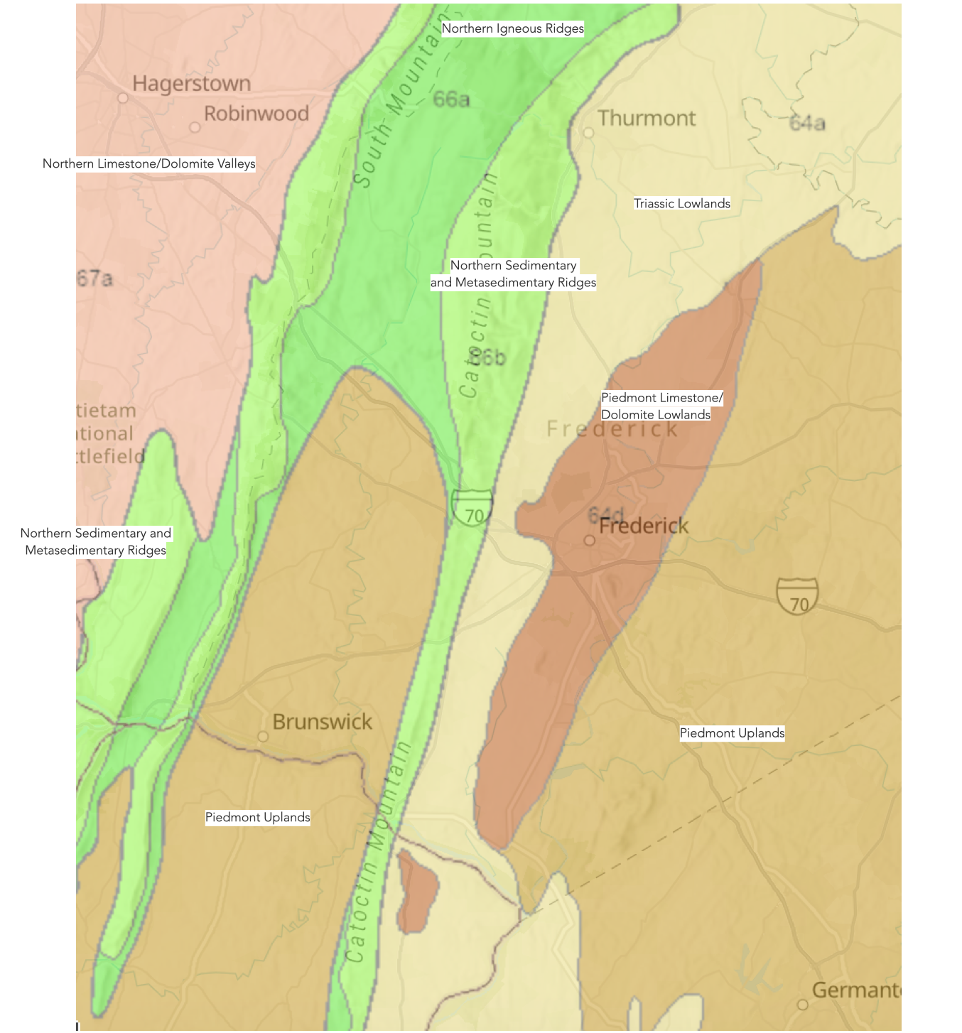My first thought was a map quilt of my town, but showing historical ecological features rather than just the current city grid. But in my search, I wasn’t able to find much in the way of historical ecological mapping at the city scale (like the Welekia Project for New York City!) What I did find, though, is the EnviroAtlas, that has a layer of data for Ecoregions. When I zoomed in to my area, this is what I found: