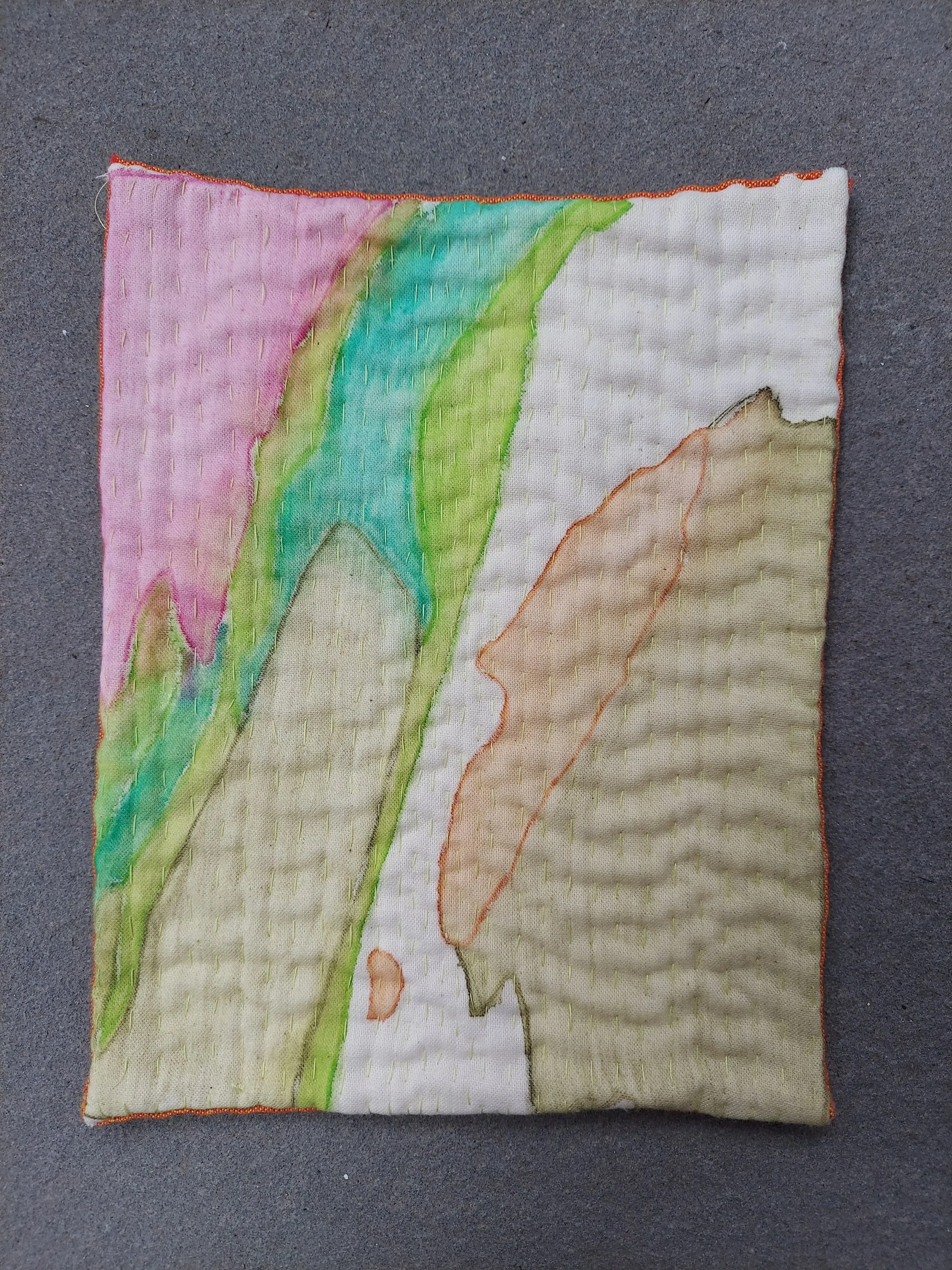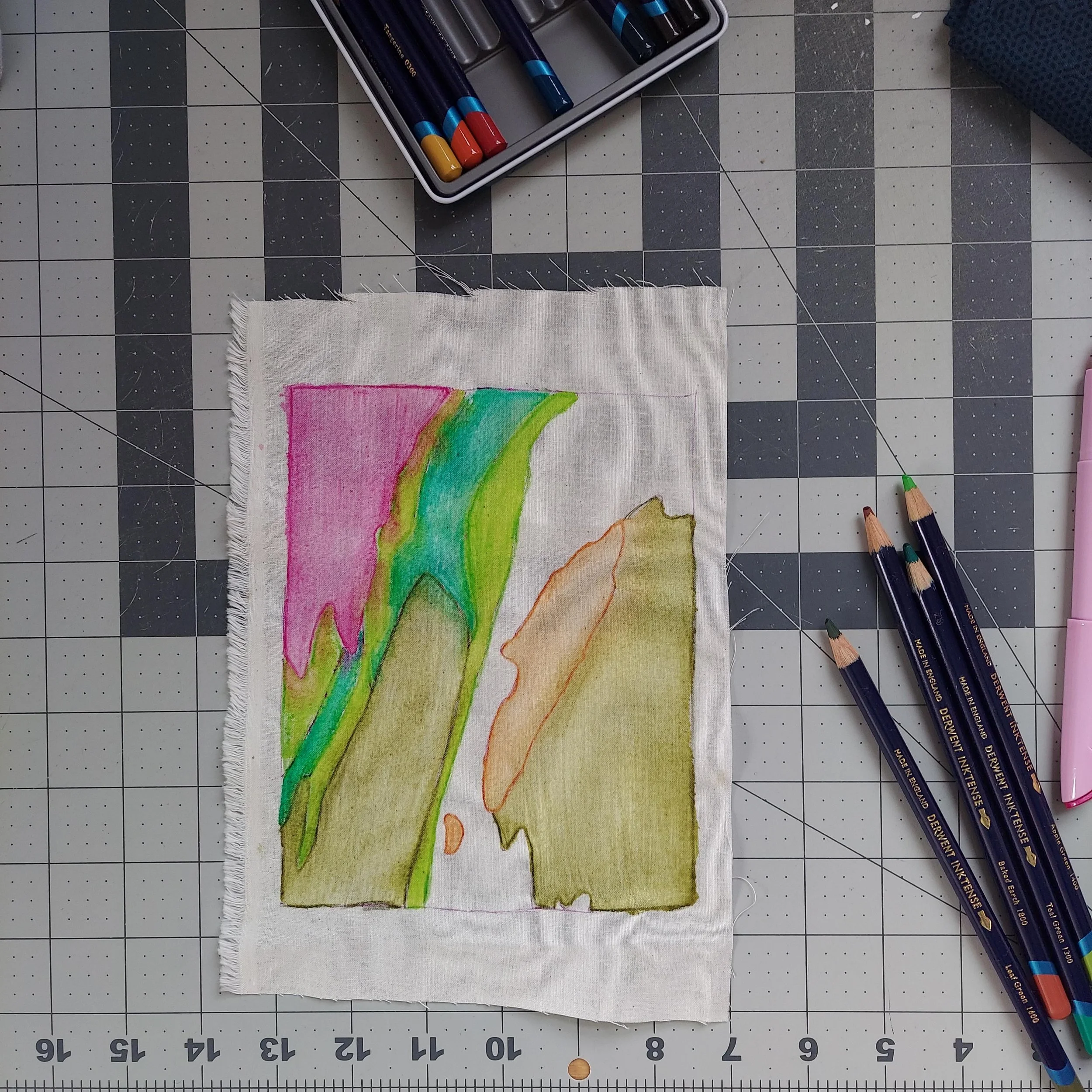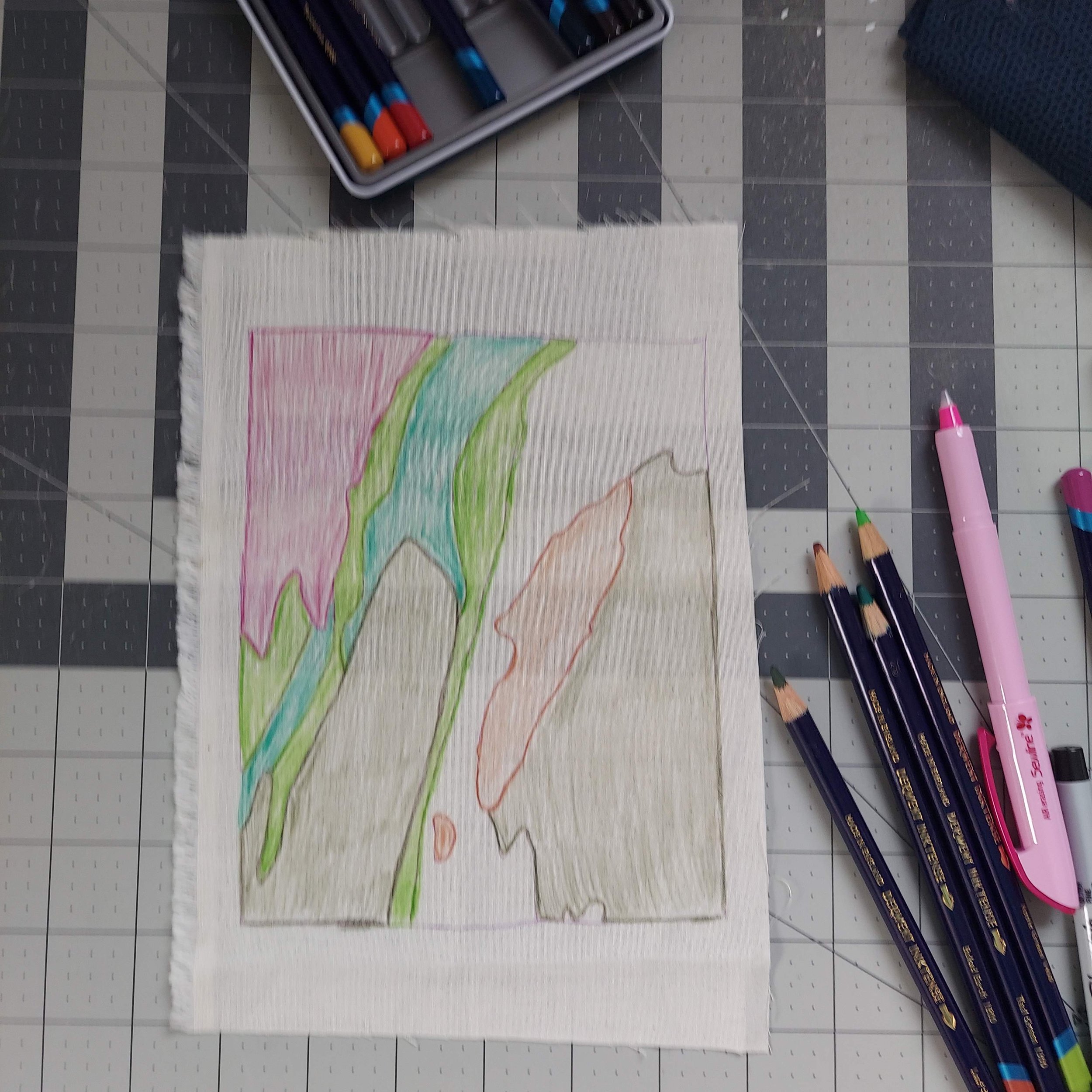 So now I was really down to the wire, and still wanted to participate, but was running out of time and options. Looking at what I wanted to achieve, I decided my best option would be to scale it down, and if I did, I might be able to use my inktense pencils to give a watercolor effect, then hand quilt the piece on the go.